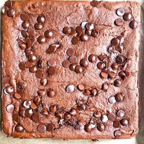 - Pour into greased 8×8 pan and sprinkle with extra chocolate chips if desired. ** see note for extra thickness