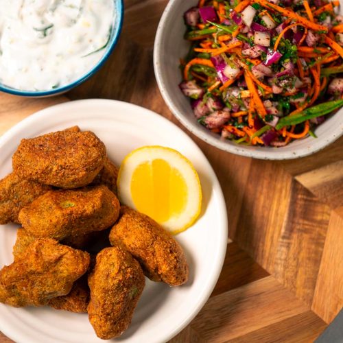 - Place the vegetable oil into a shallow small frying pan and bring to 180°C (alternatively you can use an air fryer). When the oil has come to the temperature, gently place the kofta into the oil and cook until golden. Take out of the oil, season with a little salt, and let drain on some paper towel.