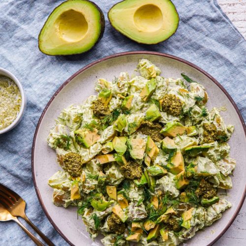 Place on a serving bowl or plate and top with avocado, pesto and dill and serve immediately