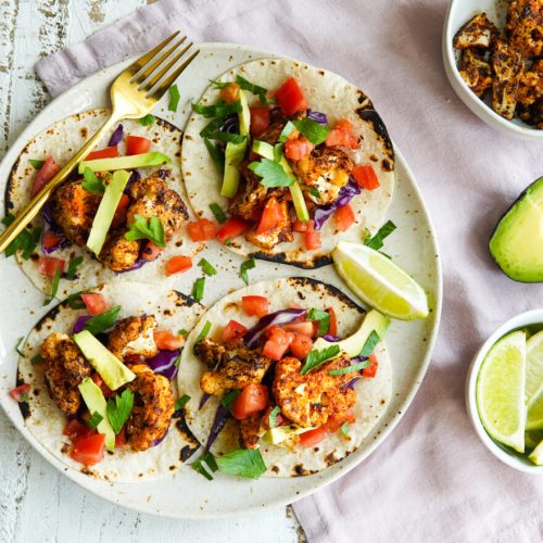To assemble the tacos, top each tortilla with dressing, purple cabbage, cauliflower, tomato, avocado and parsley. Serve warm with lime wedges