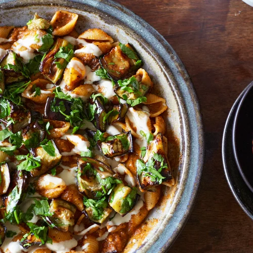 Add the reserved pasta water and half the roasted aubergine to the sauce base and heat through on a medium-high heat. Add the drained pasta and stir to warm through, about 2 minutes.